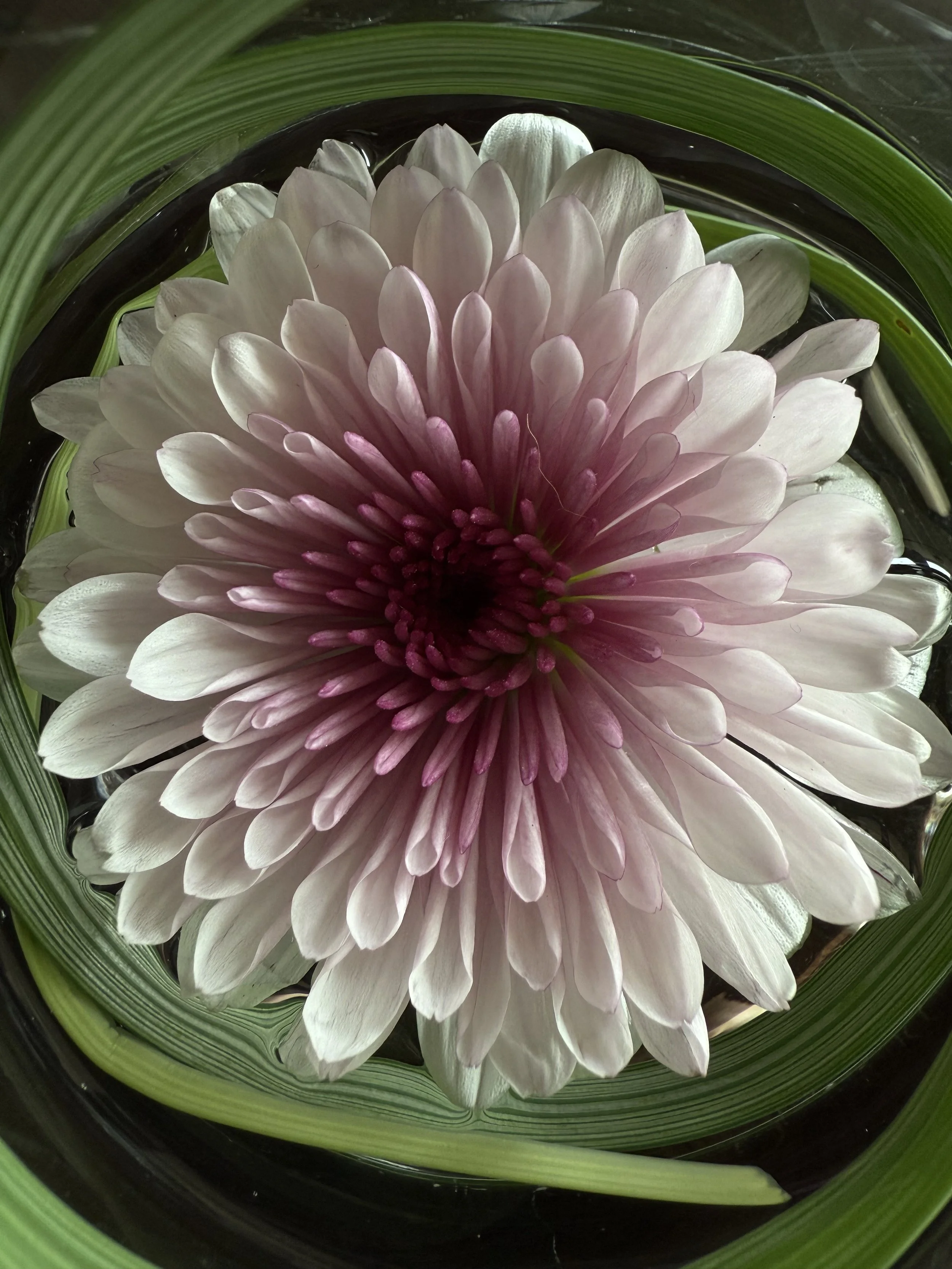 A chrysanthemum flower sits in a coffee shop, displaying vivid pink and green hues with soft whites.